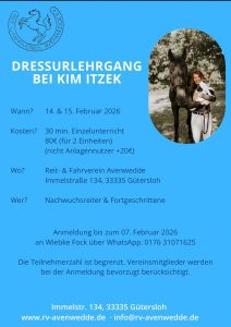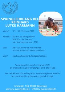 Anmeldung bis zum 07.02 (Dressur) bzw. 14.02 (Springlehrgang) über Wiebke Fock per WhatsApp.